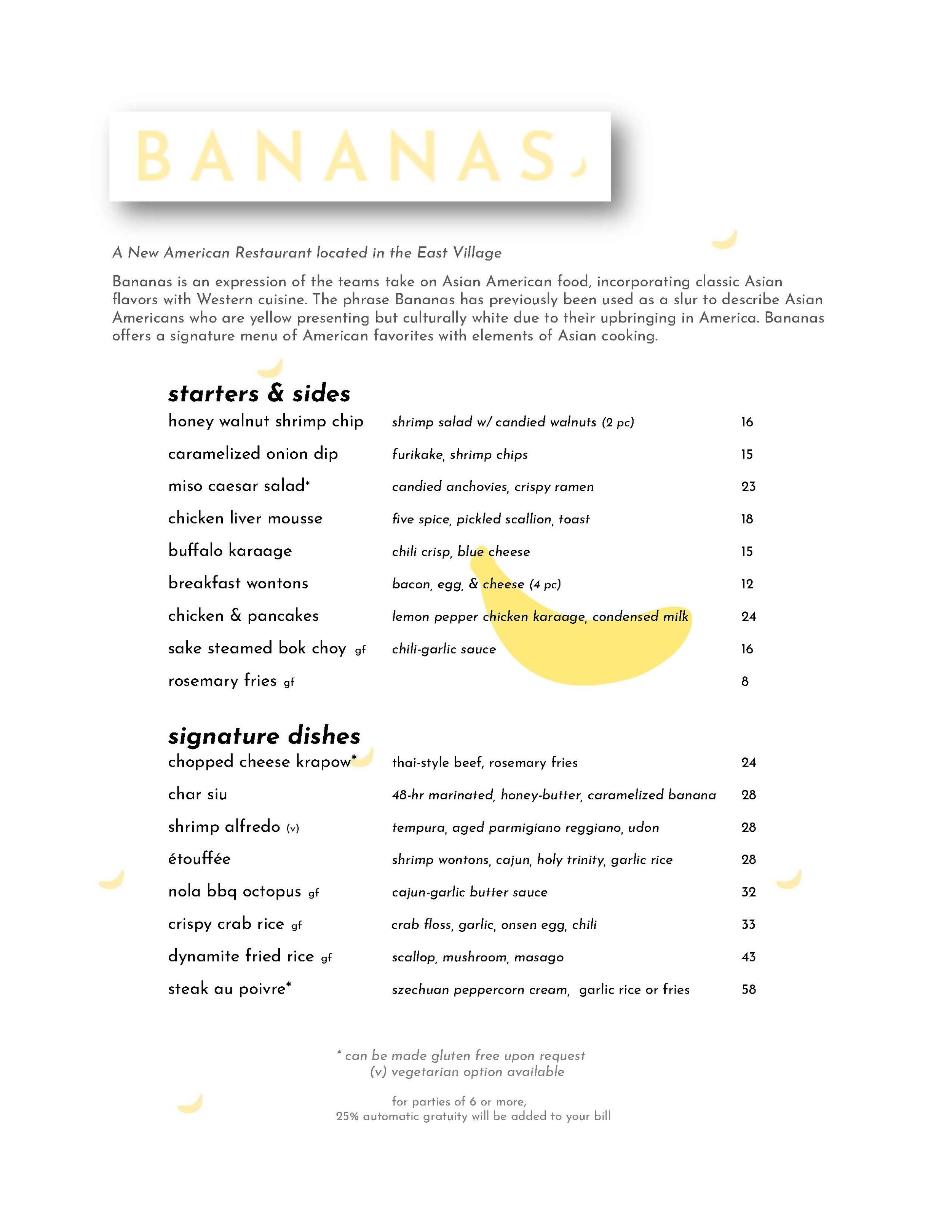 Bananas serves Asian-fusion comfort dishes, fresh tropical plates, and vibrant cocktails designed to be shared. Every dish is crafted to feel fun, flavorful, and satisfying.